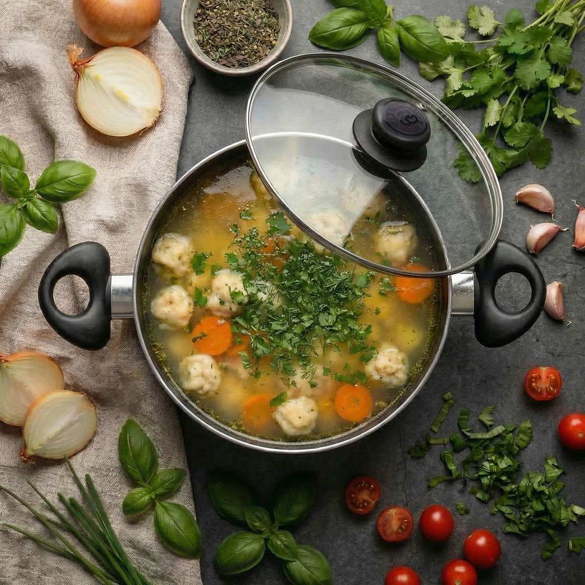Домашний, наваристый суп на курином бульоне с нежными сметанными галушками. Уютный и сытный. Основа супа: ✅ курица — 600 г ✅ картофель — 3–4 шт. ✅ вода — 2,5–3 л ✅ соль — по вкусу Галушки: ✅ яйца — 2 шт. ✅ сметана — 2 ст. л. ✅ мука — 3–4 ст. л. ✅ соль — по вкусу Поджарка: ✅ морковь — 1 шт. ✅ лук репчатый — 1–2 шт. ✅ растительное масло — 15–20 мл Для подачи: ✅ укроп и петрушка — по пучку ✅ лавровый лист — 2–3 шт. ▪️ Курицу промываем и заливаем холодной водой в кастрюле линейки KUMIR. Доводим до кипения, снимаем пену. ▪️ Варим на среднем огне 30–40 минут до готовности курицы. Солим по вкусу. ▪️ Готовую курицу достаём из бульона, остужаем и разбираем на кусочки, убирая кости и кожу. Картофель чистим и нарезаем кубиками. Отправляем в кипящий бульон и варим 10–12 минут. ▪️ Пока варится картофель, готовим поджарку. Лук мелко нарезаем, морковь натираем на крупной тёрке. ▪️ На сковороде разогреваем растительное масло, обжариваем лук до мягкости, затем добавляем морковь и жарим ещё 3–5 минут до