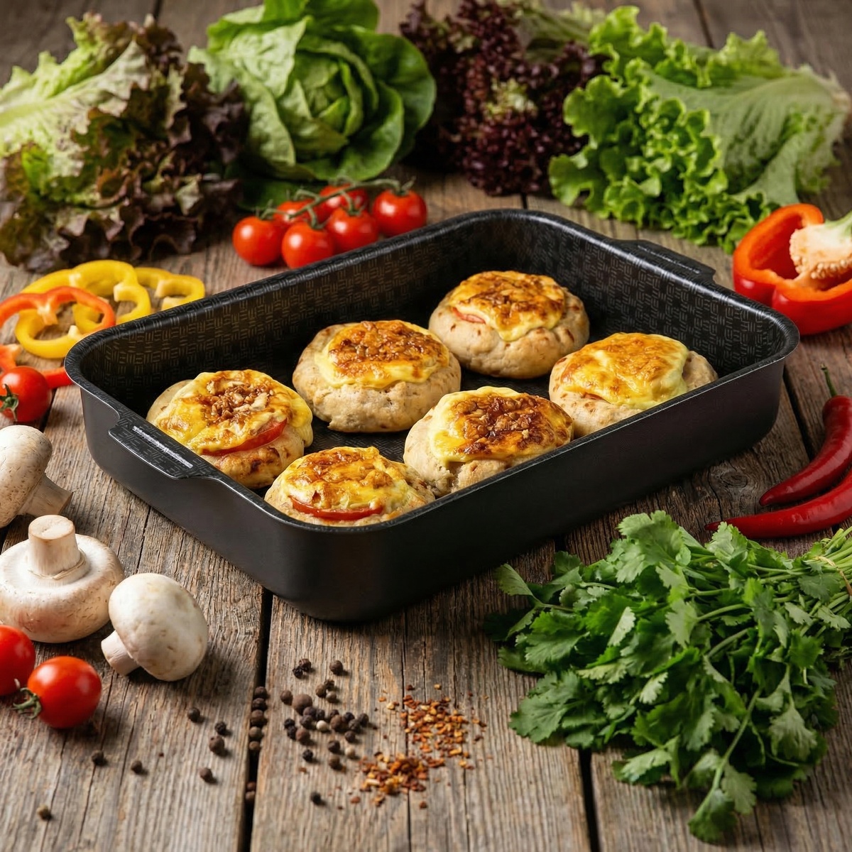 Сочные куриные биточки с ароматной начинкой из овощей и грибов, запечённые под сырно-чесночной корочкой. Для биточков: ✅ фарш куриный — 600 г ✅ лук репчатый — 1 шт. ✅ чеснок сухой — 1 ч. л. ✅ соль, перец — по вкусу ✅ топлёное масло — 40 мл Для начинки: ✅ лук красный — 1/2 шт. ✅ огурец солёный — 1 шт. ✅ шампиньоны — 3 шт. ✅ помидор — 1 шт. ✅ соль — по вкусу ✅ орегано — по вкусу Для намазки: ✅ майонез — 3–4 ст. л. ✅ сыр моцарелла — 100 г (тёртый) ✅ чеснок — 1 зубчик (измельчённый) ▪️ Лук репчатый мелко нарезаем или пюрируем в блендере. ▪️ Смешиваем куриный фарш с луком, сухим чесноком, солью и перцем. Хорошо вымешиваем. Красный лук мелко нарезаем. Солёный огурец — мелкими кубиками. Шампиньоны — тонкими пластинками. Помидор — мелкими кубиками или тонкими кружочками. ▪️ На сковороде слегка обжариваем лук с шампиньонами до мягкости (3–5 минут). Добавляем огурцы, помидоры, соль и орегано. Перемешиваем и снимаем с огня. Остужаем. ▪️ Из фарша формируем круглые плоские лепёшки толщиной около 1,