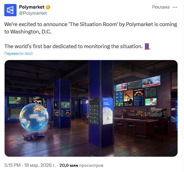 🔸Polymarket откроет в Вашингтоне «The Situation Room», первый в мире бар, специально созданный для мониторинга ситуации в мире.