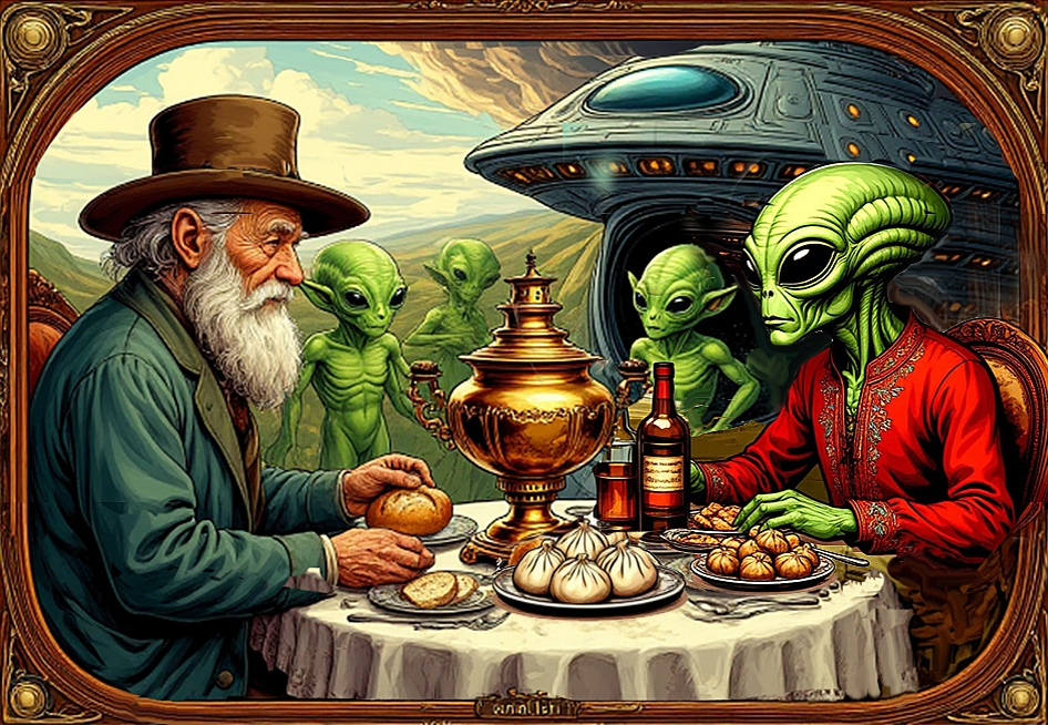 Таким образом, сакральная трапеза древних славян предстает перед нами не просто как обед, а как сложнейшая симуляция космической миссии. Самовар ревет на старте, «летающие тарелки» с «дронами-пельменями» бороздят пространство стола, а ритуальные печенья-лесенки указывают путь к далеким звёздам. Это великое культурное эхо, напоминающее нам о временах, когда боги ходили среди людей, а их корабли были привычной частью древнего пейзажа.