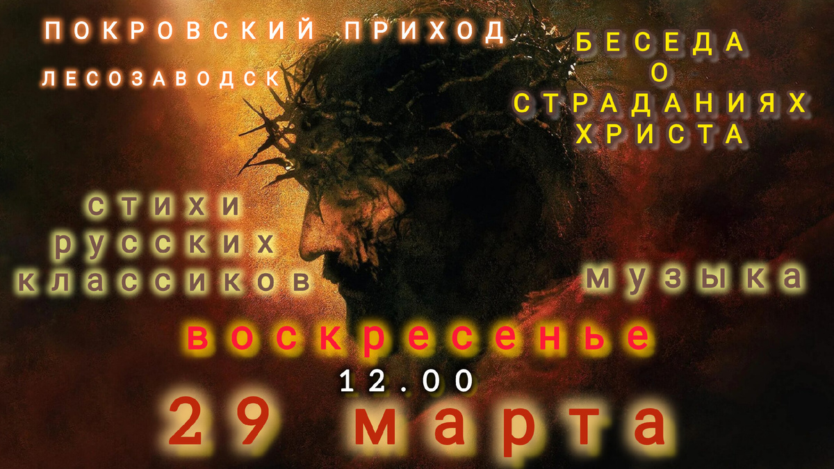 Приглашаем на беседу о страданиях Христа. 29 марта в 12.00 в нашем храме, после богослужения. Прозвучат стихи русских классиков. Музыкальные произведения сыграют ученики детской Школы искусств г. Лесозаводск. Стихи будут читать: игумен Никита (Зеленюк) и Трушкова Ксения Сергеевна, преподаватель литературы. Ждем всех.