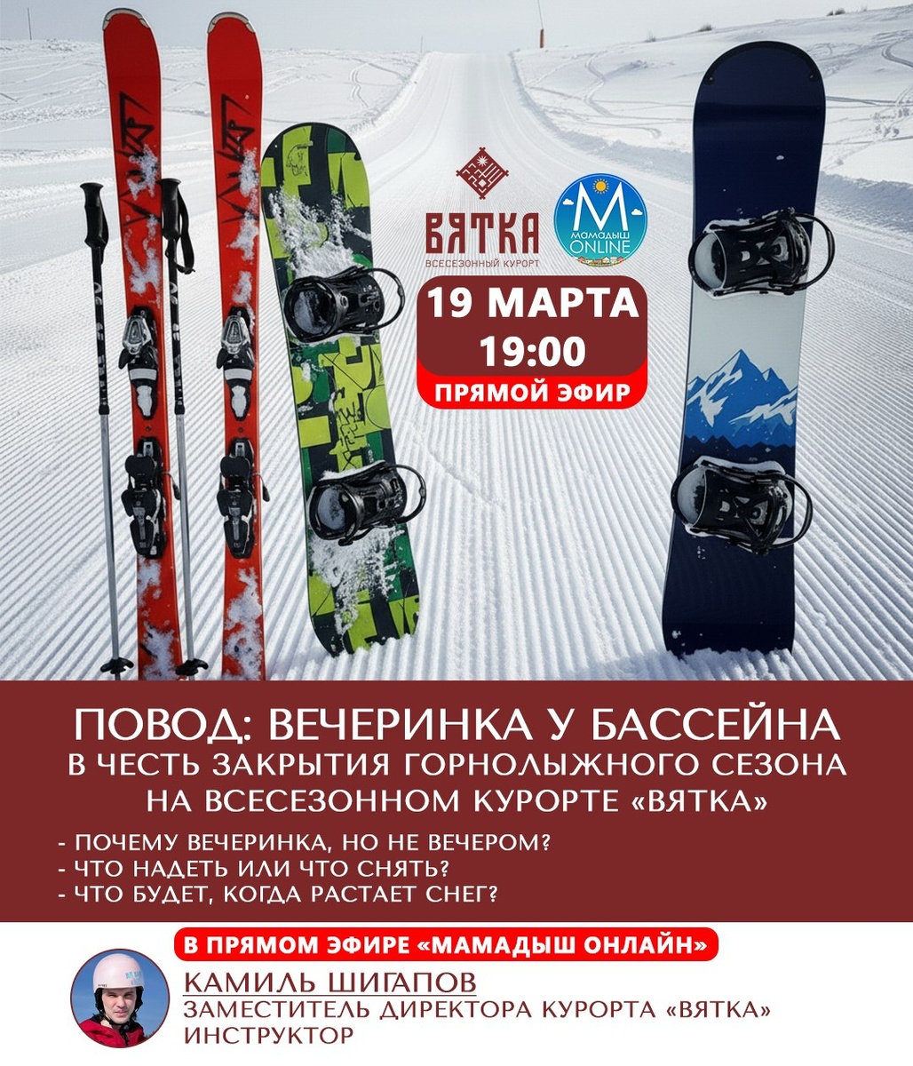 » -- 19 марта в 19:00 в прямом эфире «Мамадыш Онлайн» Камиль Шигапов, заместитель директора курорта «Вятка» и инструктор, расскажет: - Почему это вечеринка, а не просто вечер? - Что надеть или снять для участия? - Что будет, когда растает снег? Напоминаем, 21 марта на склоне курорта будет организован бассейн глубиной 60–80 см, в который участники смогут спускаться на лыжах и сноубордах в купальниках или карнавальных костюмах. ✅ Подписаться l Мы в Max