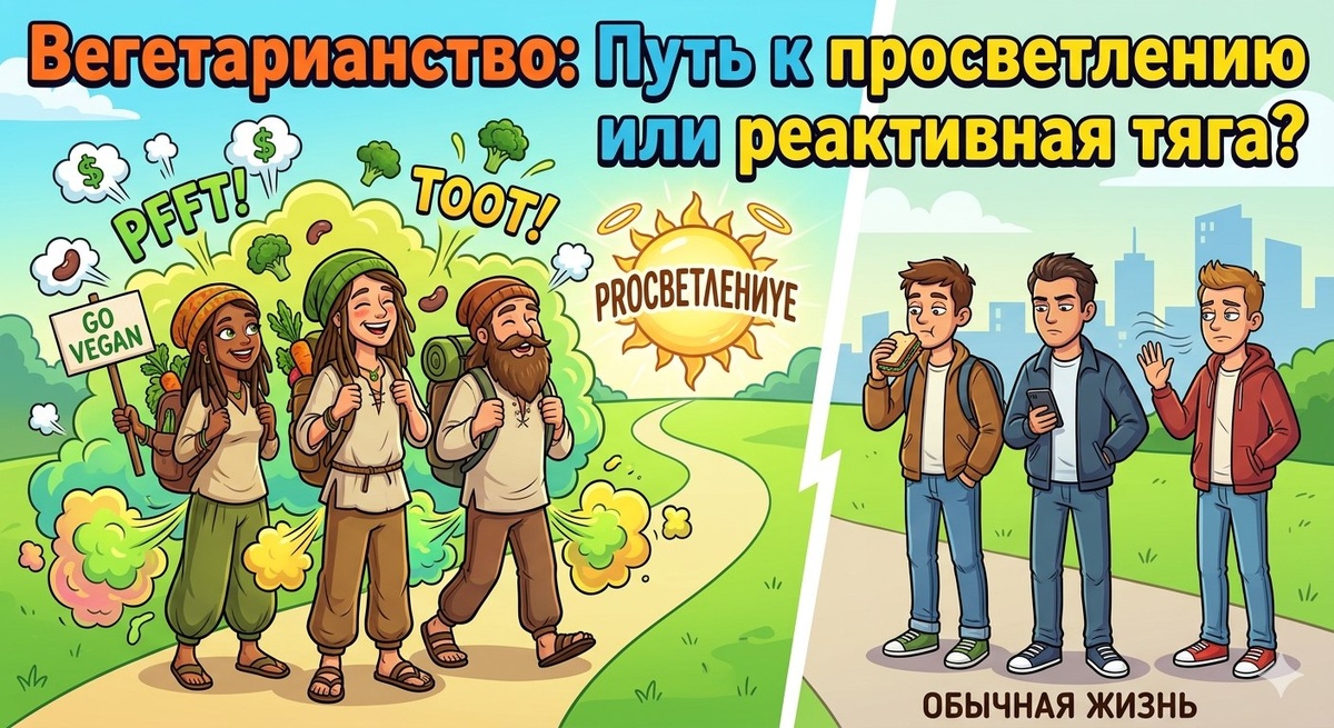 Вот и настал момент сорвать маску с самой «экологичной» части человечества! Мы все привыкли думать, что вегетарианцы — это такие лесные эльфы, питающиеся росой и солнечным светом. Но если вы когда-нибудь оказывались в закрытом лифте с любителем нутового хумуса, вы знаете горькую (и пахучую) правду. Научный факт Причина этого феномена прозаична. Растительная диета богата сложными углеводами (олигосахаридами), которые содержатся в бобовых, капусте и цельнозерновых продуктах. Наш тонкий кишечник не умеет их расщеплять, поэтому они отправляются прямиком в толстую кишку. Там их радостно встречают бактерии, устраивая настоящий пир с выделением газов: водорода, углекислого газа и метана. В итоге, согласно исследованиям, люди на строгой растительной диете могут производить в 7 раз больше газов в сутки, чем мясоеды. Важное уточнение: Ребята, мы вас любим! Ваша микрофлора просто слишком активно празднует каждый съеденный кабачок. Вы не «пукаете», вы просто делитесь энергией солнца в газообр