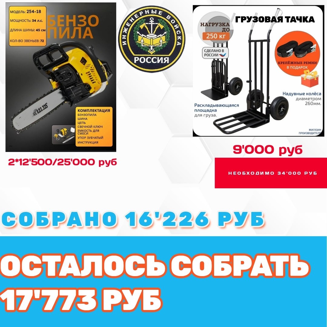 Продолжаем сбор для инженерно-саперного батальона. 1. Бензопила - 2 шт. 2. Грузовая тачка 📌Сумма к сбору - 34'000 руб. 🔺Собрано - 16'226 руб 🔺Осталось собрать - 17'773 руб Поддержите, пожалуйста, сбор. Перевод можно совершить по номеру карты 💳2202208188194204 или по номеру телефона 📞+79530562233 Получатель - Светлана Владимировна Л. (Сбербанк) #уралсвоихнебросает #вместемысила
