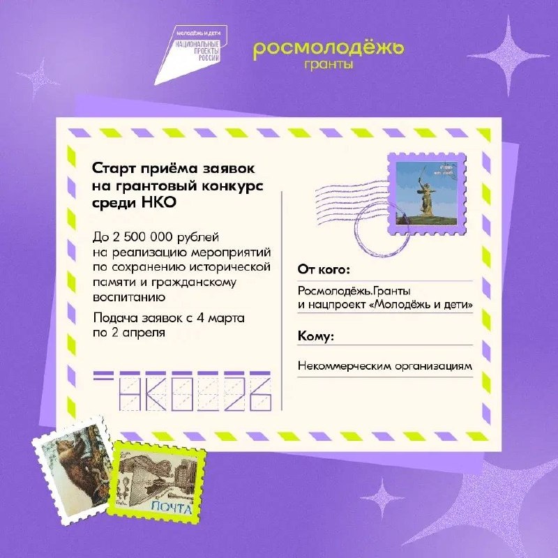 🇷🇺 Конкурс проводит Росмолодёжь в рамках национального проекта «Молодёжь и дети». Номинации конкурса: #оживляя_историю – изучение и сохранение местного наследия #помогая_своим – поддержка ветеранов и участников боевых действий #воспитывая_характер – военно-спортивное воспитание, допризывная подготовка и популяризация БПЛА #транслируя_ценности – создание патриотического контента для молодёжи #укрепляя_сознание – противодействие терроризму и экстремизму ✔️ Заявки принимаются до 2 апреля 18:00 (мск): vk.cc/cV2ZrC. Подробнее о конкурсе по ссылке: https://clck.ru/3SaXWP. #Росмолодёжь #РосмолодёжьГранты #РосмолодёжьГрантыЮгра Мы в Max | ВК | ОК | Телеграм | Официальный портал | Дзен