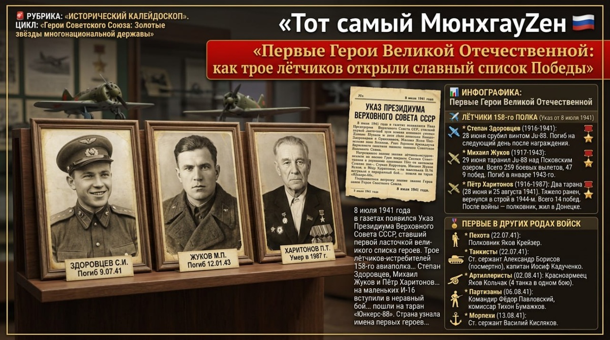 🚨 Рубрика: «Исторический калейдоскоп» Цикл: «Герои Советского Союза: Золотые звёзды многонациональной державы» 📅 Первые Герои Великой Отечественной: как трое лётчиков открыли славный список Победы 🔹 Пётр Харитонов: учитель, ставший асом. Пётр из Тамбовской губернии успел поработать плотником на Дальнем Востоке, потом учителем в Улан-Удэ, и лишь затем, по призыву, попал в авиацию. 28 июня он совершил свой первый таран, отрубив руль высоты «Юнкерсу», а 25 августа повторил подвиг. В том бою его самолёт был подбит, Харитонов выбросился с парашютом, и пока он спускался, немецкие лётчики, повиснув рядом, расстреливали его из пистолетов. Чудом ни одна пуля не попала в цель. В сентябре 1941-го он получил тяжелейшее ранение и более года провёл в госпиталях. Врачи совершили невозможное: он вернулся в строй в 1944-м и продолжил бить врага. Всего на его счету 14 сбитых самолётов. После войны Пётр Тимофеевич служил, окончил академию, вышел в запас полковником. Жил в Донецке, работал в штабе г