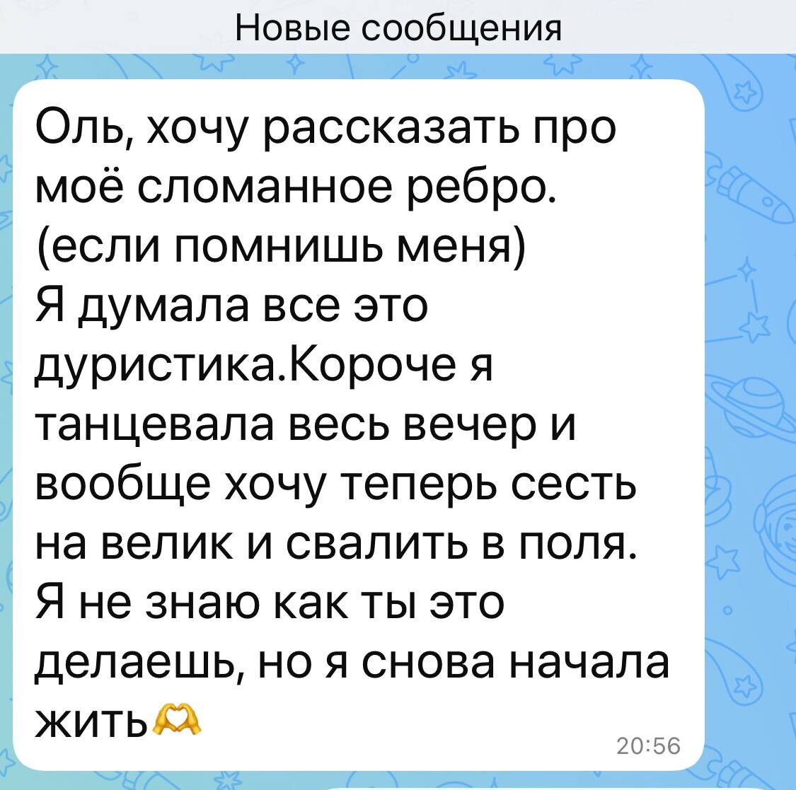 😂 Интересная история. Я делала татуировку и пришла девушка. Оказывается мы с ней землячки - она тоже из Мурманска😍 Я увидела, что она мучается болью. Оказалось упала с лестницы и сломала ребро. И оно болит и не дает ей двигаться и дышать нормально. Я предложила помощь. Очень скептически сначала она отнеслась к этому, но легла) Я положила руки. Что удивительно- она чувствовала холод и мои руки как металл. Обычно из моих рук идет тепло и жар. Потом у нее полились слезы. Это вызвало шок у нее. Я успокоила - психосоматика выходит. В общем 5 минут у нас было. Потом она встала и сказала, что боль не такая острая. Она утихла. Мы подружились и поехали на шашлыки. Она там так вытанцовывала, а я сидела и просто с изумлением смотрела на нее. Вчера она написала мне и попросила посмотреть маму. Об этом напишу потом.