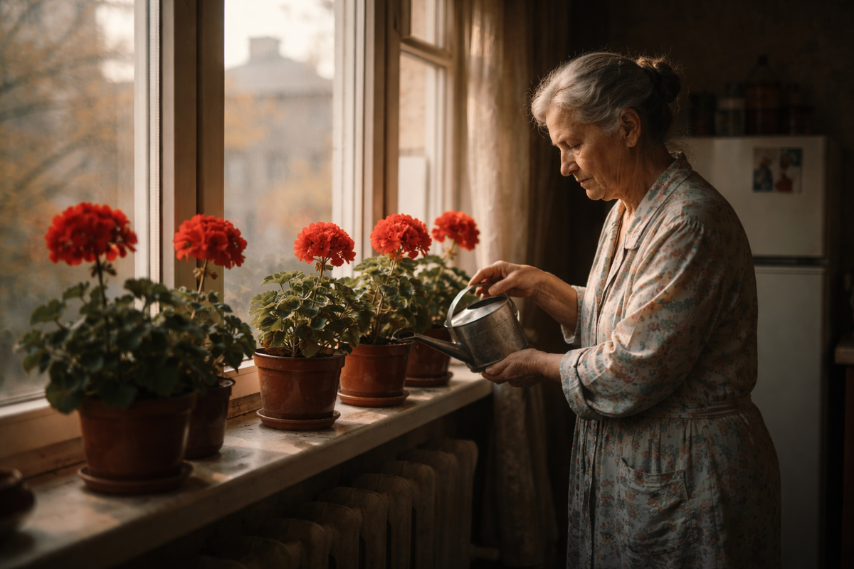 Герани у неё было много. Пять горшков на подоконнике, все красные. Сын Алёша в детстве говорил, что они похожи на маленькие костры. Она помнила это до сих пор — как он стоял на табуретке, прижимался носом к стеклу и говорил: «Мам, у нас подоконник горит». Ему было лет шесть. Она тогда засмеялась и поставила его на пол. Он обиделся, что она не восхитилась, и надулся до ужина.