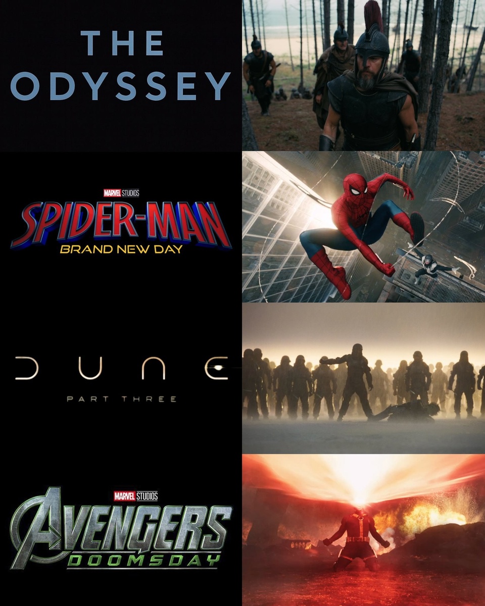 • «Одиссея» — 17 июля • «Человек-паук: Новый день» — 31 июля • «Дюна: Часть третья» — 18 декабря • «Мстители: Судный день» — 18 декабря 🔥— жду всё, это будет разнос 😭 — никаких ожиданий не строю