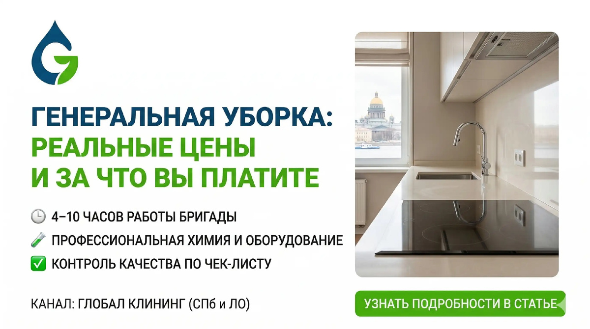 На деле генеральный клининг — это глубокая очистка каждого квадратного сантиметра, включая фасады, радиаторы и вытяжки. Разберем детально, сколько стоит генеральная уборка на самом деле, из чего складывается цена генеральной уборки и почему попытка сэкономить обычно приводит к переделкам.