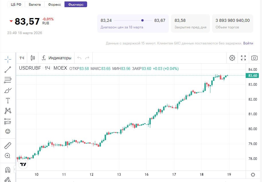 ? 📌 Рубль в среду, 18 марта, продолжил быстро дешеветь. Юань установил годовой максимум, приблизившись к уровню 12,2 рубля. «Нехватка китайской валюты обостряется на российском рынке: процентные ставки по краткосрочным кредитам в юанях превысили 20% годовых впервые с ноября 2024 года», — отмечают эксперты БКС «Мир инвестиций. 📌 Доллар преодолел отметку 83 рубля. 📌 Фактор налогового периода всё же может заметно сгладить рыночный дисбаланс, способствуя замедлению снижения курса рубля и переходу к коррекционным попыткам, считают аналитики. Ощутимое подорожание иностранной валюты к российской может провоцировать экспортеров заранее продавать валютную выручку для исполнения фискальных платежей, пик которых приходится на 25 и 30 марта. 📌 Ранее Бизнесмен Олег Дерипаска отмечал, что внезапный конфликт на Ближнем Востоке не принесёт России пользы, несмотря на рост цен на нефть, газ и удобрения и возможное ослабление санкций. По его мнению, мировая экономика из-за высоких цен на энергон