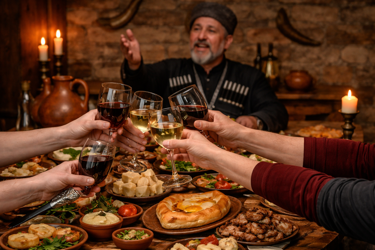 Если вы хоть раз были на грузинском застолье, то наверняка замечали одну странную вещь. Здесь почти не пьют «просто так». Каждый бокал — это не пауза между блюдами, а отдельный смысл. И именно поэтому грузинские тосты могут длиться дольше, чем сам ужин. Но самое интересное — не в их длине. А в том, за что именно поднимают бокал. Первое, что стоит понять: в Грузии тост — это не импровизация ради веселья. Это почти ритуал, у которого есть своя логика и даже порядок. За столом всегда есть человек, который ведёт застолье — тамада. И именно он задаёт тон, выбирает темы и следит за тем, чтобы разговор не превращался в хаос. Самый главный тост — за мир. И здесь важно не путать его с формальностью.