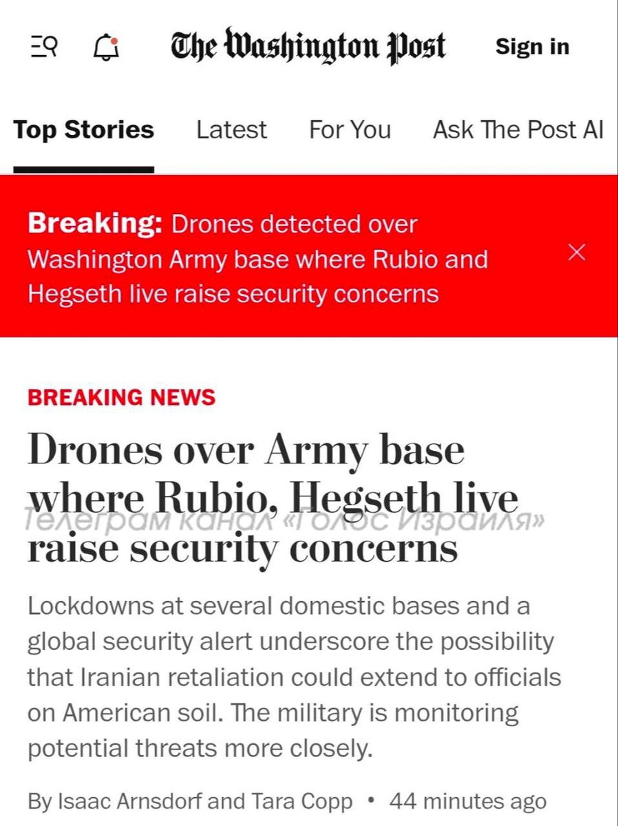 войны Пит Хегсет. (The Washington Post) Сообщается о серьёзных опасениях возможных атак иранских дронов на территории США. В связи с этим меры безопасности для Рубио и Хегсета были усилены. Отмечается, что АНБ США ещё в январе 2021 года перехватило коммуникации, в которых боевики КСИР Ирана обсуждали возможную атаку дронами на базу Форт Макнейр. ___________ 🎙Будь в курсе событий 🇮🇱 Подпишись на «Голос Израиля»
