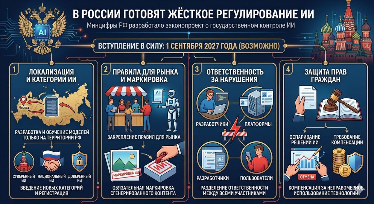 Минцифры России разработало законопроект о государственном контроле за искусственным интеллектом. Документ вводит само понятие ИИ, закрепляет правила для данного рынка и может вступить в силу с 1.09.2027. Ключевые положения: разработка и обучение моделей — только на территории России, появятся новые категории «суверенных», «национальных» и «доверенных» ИИ. Также вводится обязательная маркировка сгенерированного контента, а ответственность за нарушения разделят между разработчиками, платформами и пользователями. Отдельный блок касается защиты граждан: появится возможность оспаривать решения, принятые с помощью ИИ, во внесудебном порядке, а также требовать компенсацию за неправомерное использование технологий. Распространение материалов допускается только с указанием ссылки на источник. 🤩 PRO News: мы там, где вы!