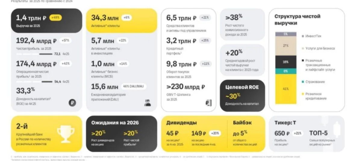 Тинькофф Банк показал рекордную выручку в 1,4 трлн рублей в 2025 году. Анализ финансовых результатов и прогнозы на 2026 год. Среди ключевых решений и фактов: Выручка Тинькофф Банка за 2025 год выросла на 49% до 1,4 трлн рублей — рекордный показатель за всю историю; Операционная чистая прибыль увеличилась на 43% до 174,4 млрд рублей, превысив изначальные прогнозы; Количество активных клиентов достигло 34,3 млн, что на 6% больше, чем годом ранее; Рентабельность капитала составила 29,1% за год и 33,3% за IV квартал 2025 года. Читать полностью