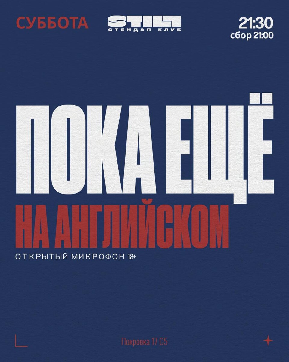 ) ▪️Doors at 21:00 ▪️Show from 21:30-23:00 👼 That's right, angels, we aren't going anywhere! Our signature weekly open mic is still at Still 🎤 ...just under a brand new name! Come have some fun, make some new friends, and enjoy a laugh or two! 𐦂𖨆𐀪𖠋 💵Entrance: 500 rub 🔗 Buy tickets here Use promo code ⚠️ stillstudent ⚠️ for a 40% discount 📍Still StandUp Moscow 🗺 Pokrovka 17c5, through the arch with the pink lights 🏙 Blue building directly inside the courtyard And afterwards... have you been to Жажда? 🧑🎤 It's a new hidden gem for casual parties, on its way to be the unique new expat bar in Moscow! Join us there after the open mic for an afterparty starting at 11:00 pm 💃There'll be tattoo artists, sketch artists, DJs, and new international friends! 📍Жажда 🗺 Map: Bolshoy Tryokhsvyatitelsky Lane, 2/1с8 Info for comedians to sign up: Step 1️⃣ Make a story or a post using the poster above, tagging Moscow.english.comedy.events on Instagram or mentioning us on a pla