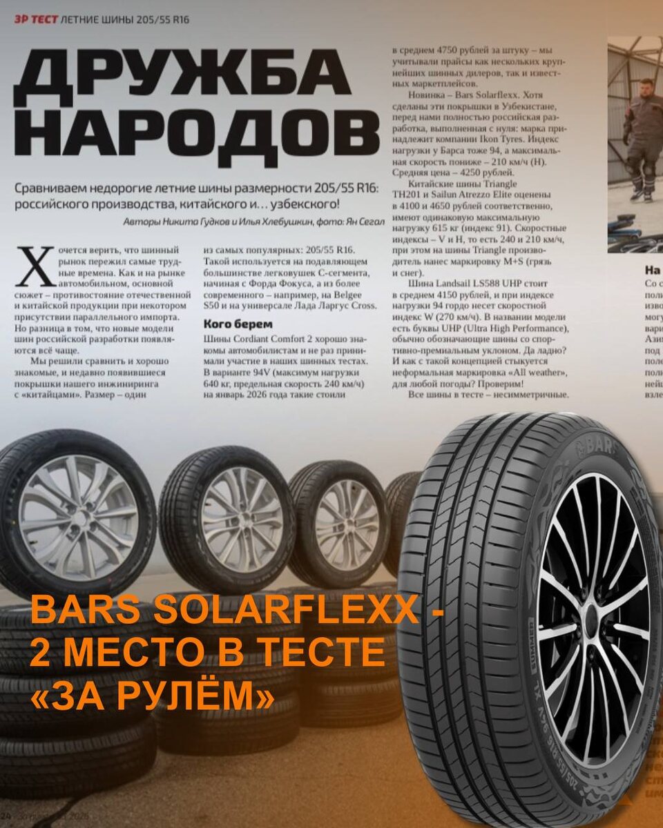 Испытания проводились в Краснодарском крае на аэродроме «Азимут» - на сухом и мокром асфальте с замерами торможения, управляемости и комфорта. В тесте участвовали 5 брендов, включая российские и китайские модели. 🔧 По итогам испытаний: Bars Solarflexx заняли 2 место (894 балла) 📍 Шины произведены в Узбекистане, при этом это полностью российская разработка компании Ikon Tyres Что отметили эксперты: ✅ сбалансированное и безопасное поведение ✅ уверенность при резких манёврах и торможении ✅ прогнозируемая управляемость 📊 В целом шины показали себя как один из лучших вариантов в своей категории