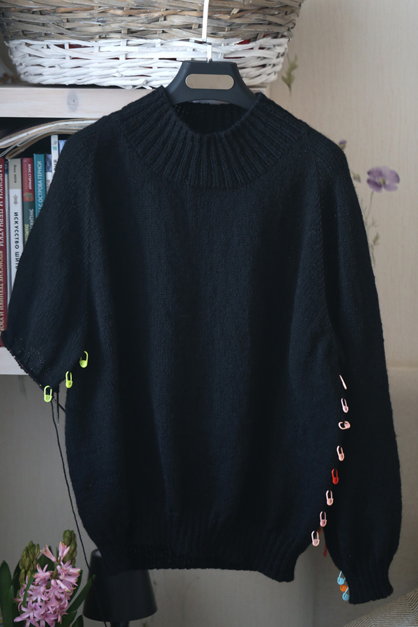 Свитер растёт! Иду на морально-волевых, так как ни цвет, ни фактура на сегодняшний светящийся солнцем день, уже не вдохновляют. Несмотря на утренние -27, весна всё равно чувствуется и требует, требует если не ярких цветов, то хотя бы облегчённых составов: тянет на хлопок, букле, чего-то такое... ух! Я уже на всё согласна, даже на жаккарды с цветочками, лишь бы снять с себя груз двух свитеров из шерсти с альпакой: зелёного с узорами Гернси и этого чёрного: