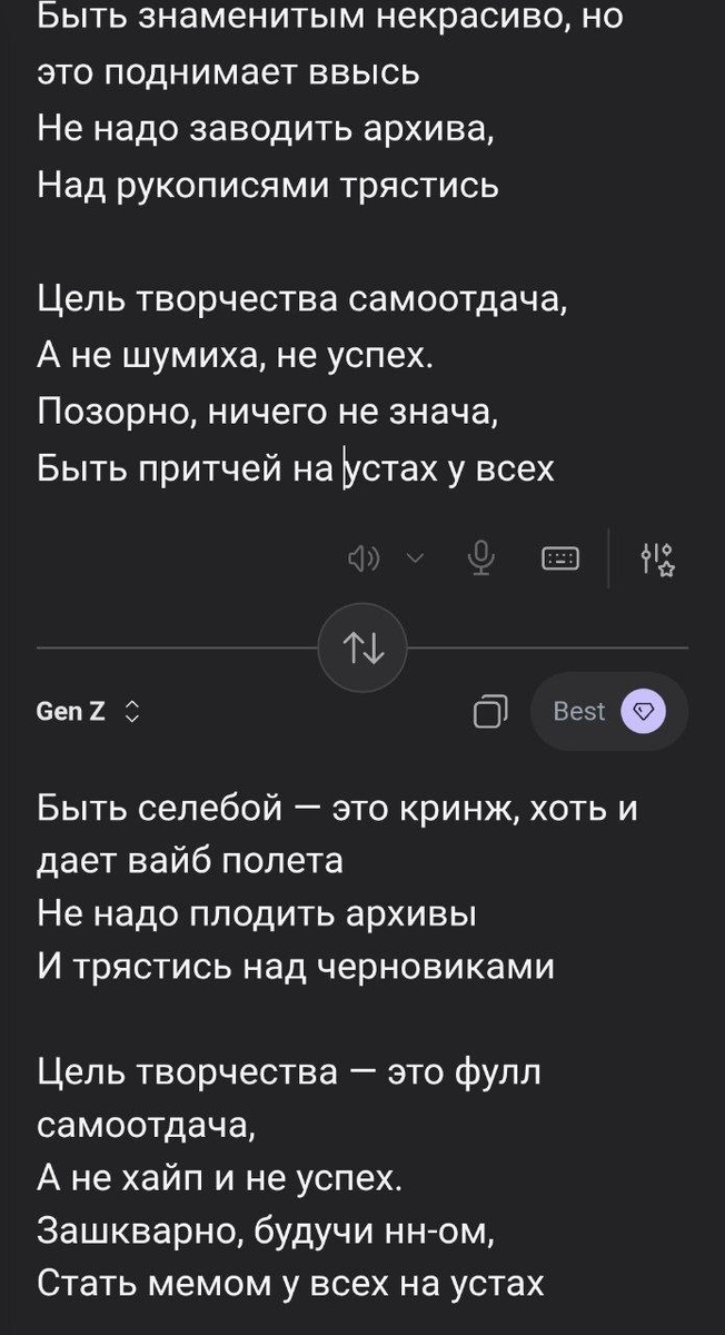 Я решила поиграть тоже, поэтому наслаждайтесь. Это переводчик Kagi, в который добавили такое. Если тоже будете играть и получится что-то интересное — присылайте в комментарии. Лингвостории