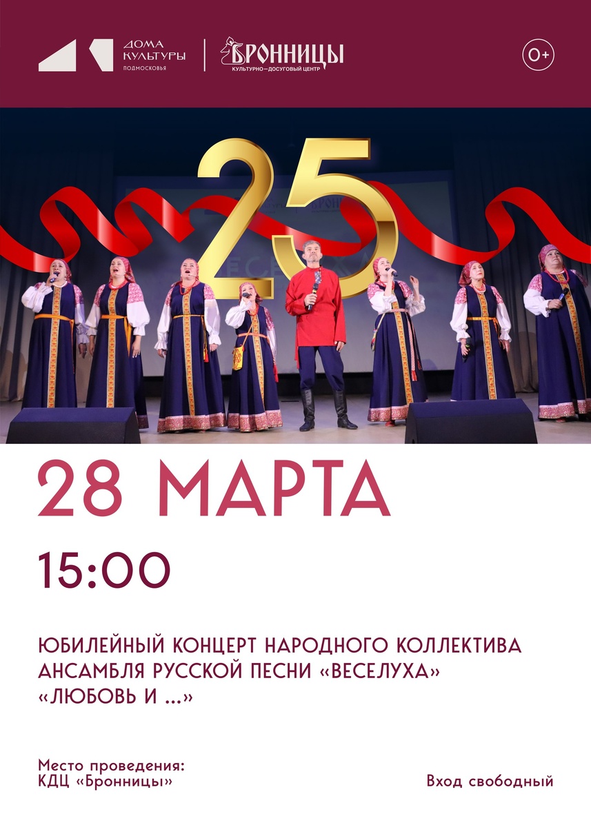 КУЛЬТУРНО-ДОСУГОВЫЙ ЦЕНТР "БРОННИЦЫ" ПРИГЛАШАЕТ ВАС НА РАДОСТНОЕ СОБЫТИЕ - ЮБИЛЕЙНЫЙ КОНЦЕРТ АНСАМБЛЯ РУССКОЙ ПЕСНИ "ВЕСЕЛУХА" "ЛЮБОВЬ И..." 0+