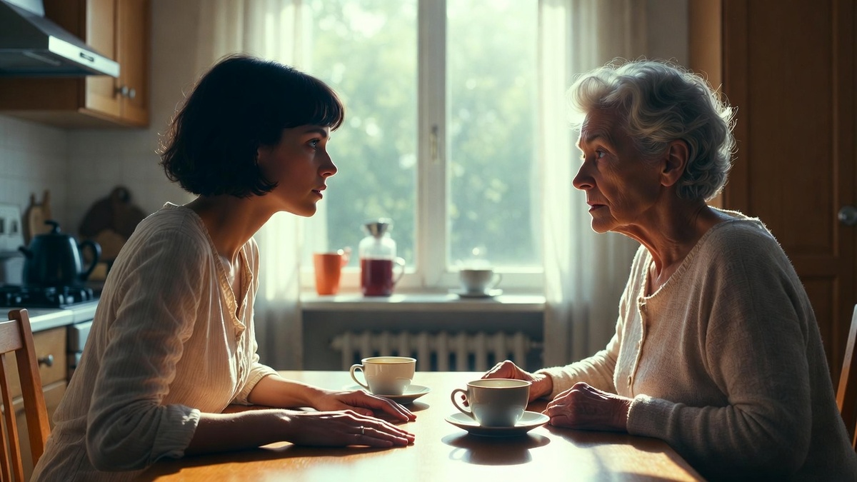 Свекровь присела напротив, сложила руки на коленях. Картинка была почти трогательная: пожилая женщина, аккуратно причёсанная, в цветастом халате. Только глаза выдавали. В них плескалось что-то острое.