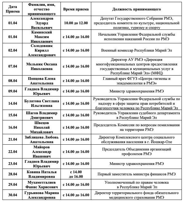 Стало известно, как жителей Марий Эл буду принимать чиновники в предстоящем апреле 2026 года