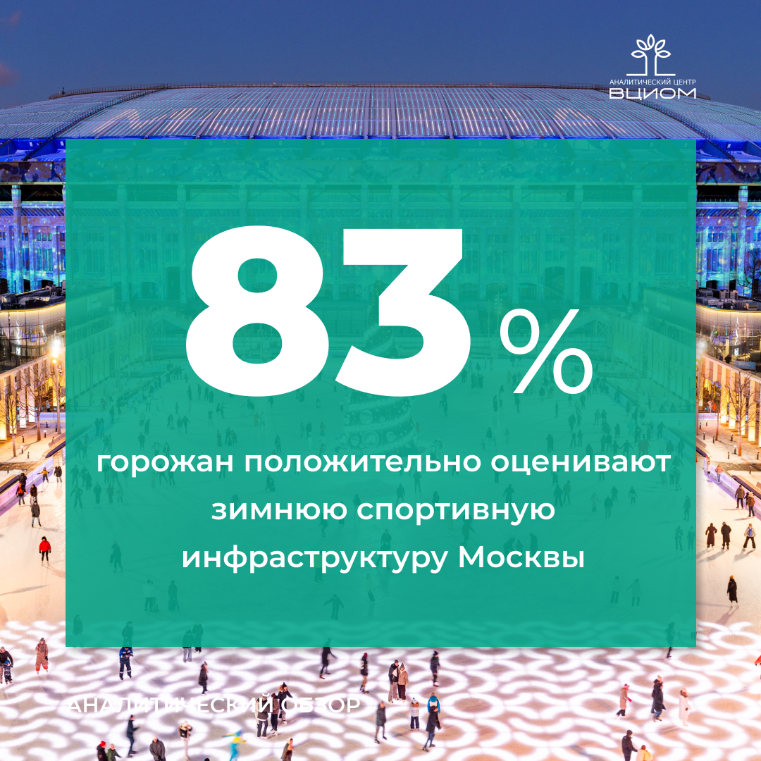 83% горожан и абсолютное большинство посетителей (97%), опрошенных непосредственно на площадках, положительно оценивают текущее состояние зимней спортивно-досуговой инфраструктуры Москвы, а негативно высказались лишь 3% горожан и 1% посетителей. Спортивные развлечения в холодное время года прочно вошли в повседневную жизнь москвичей. Самыми популярными зимними занятиями стали катание на коньках, которым хотя бы иногда занимаются 47% опрошенных, катание с горок (37%) и беговые лыжи (30%). Уровень удовлетворенности от посещения спортивных объектов очень высок. Подавляющее большинство горожан отмечают, что довольны посещением московских спортивно-досуговых объектов. Аналогично высокие оценки получили комфортность условий для ожидания, чистота и работа сотрудников проката. Для гостей столицы зимние развлечения стали важным фактором при выборе направления для путешествия. Две трети туристов признаются, что их интересуют такие предложения. Проект «Зима в Москве», объединяющий эти активности