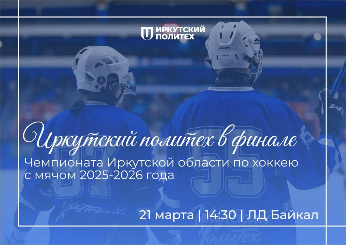 ! ⚡️ Команда «Иркутский политех» вышла в финал чемпионата Иркутской области по хоккею с мячом. Хоккейная команда «Иркутский политех» сразится за золото в финальном матче с командой «Байкал-Энергия ветераны» 🔥 Матч состоится: 📆 21 марта 📍 Ледовый дворец «Байкал» (ул. Лермонтова,249) ⏰ 14:30 📎 Вход свободный Следите за нашими новостями и болейте за команду «Иркутский политех»! А нашим парням пожелаем красивой игры и, конечно, победы! Болей за наших! Болей за «Иркутский политех» 💙 👻 МАХ | 💙 ВК | 📝 ДЗЕН