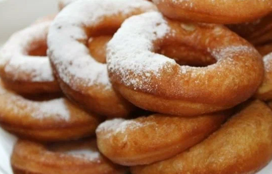 Ингредиенты: - 400 г муки - 1 стакан воды - 50 г дрожжей - 2-3 ст. л. растительного масла - растительное масло для жаренья - сахарная пудра для посыпки Приготовление: Дрожжи раскрошить, развести их теплой водой, постепенно добавить муку и замесить тесто. Когда тесто поднимется, добавить 2-3 ст. л. растительного масла и вымесить. Можно на полчаса положить тесто в холодильник. Сформовать пончики, обжарить их в раскаленном растительном масле, выложить на кухонную решетку, чтобы стек лишний жир, а затем посыпать сахарной пудрой.