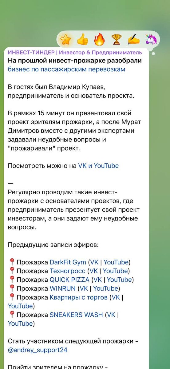 Стабильно 2 раза в месяц провожу инвестиционные прожарки различных бизнес-проектов Вместе с инвесторами задаем неудобные вопросы, анализируем фин.модель и оцениваем риски Получается весьма прямой диалог с основателем проекта, где за 1 час разбираем все подводные камни За все время прожарил уже больше 30 проектов в прямом эфире и запись к части из них доступна в канале инвест-тиндер А сегодня проведу очередную прожарку в 19:00, придет собственник с интересным проектом до 100% годовых Кому интересно прийти на прожарку и посмотреть записи предыдущих напишите мне в личку «100» - @murat_dimitrov