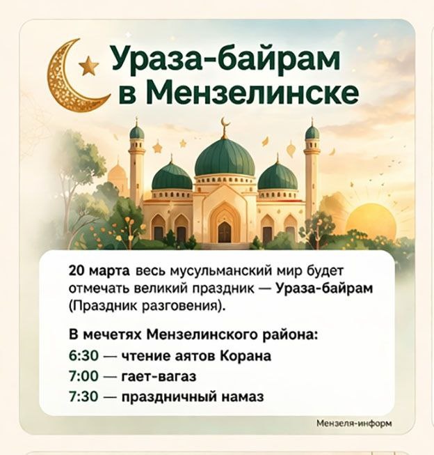 Считается, что впервые Ураза-байрам отметили по наставлению пророка Мухаммеда в 624 году. В мечетях сел Мензелинского района и в Мензелинской мечети гает начнут праздновать в 6.30 часов утра со чтение аятов Корана; 7.00 – гает-вагаз; 7.30 – праздничный намаз. На Ураза-байрам верующие совершают праздничную молитву, поздравляют друг друга и посещают родственников. Также принято помогать нуждающимся, раздавать милостыню и устраивать семейные праздничные обеды. Боле подробно о празднике Ураза-байрам смотрите в наших карточках.