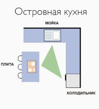 🔥 П-образная планировка подходит для большинства кухонь шириной от 240 см. В более маленьком или узком помещении она будет неудобна в использовании. Согласно такой схеме, плита, мойка и холодильник располагаются на каждой из сторон гарнитура. Преимущество этого варианта состоит в том, что до всех «вершин» треугольника можно дотянуться, просто протянув руку. Параллельная кухня🔁 Параллельная планировка,подойдет для проходных и достаточно просторных помещений. Дело в том, что расстояние между рядами мебели, для удобного прохода, должно составлять около 120 см, а стандартная ширина кухонной мебели – 60 см. Отсюда получаем, что минимальная ширина кухни для параллельной планировки должна быть не менее 240 см. В более узком помещении дверцы шкафов будут стукаться друг об друга и создавать дискомфорт. В такой планировке правило рабочего треугольника применяется следующим образом: холодильник и мойку располагают на одной стороне гарнитура, а – плиту на противоположной. Кухня с островом🏝 Бол