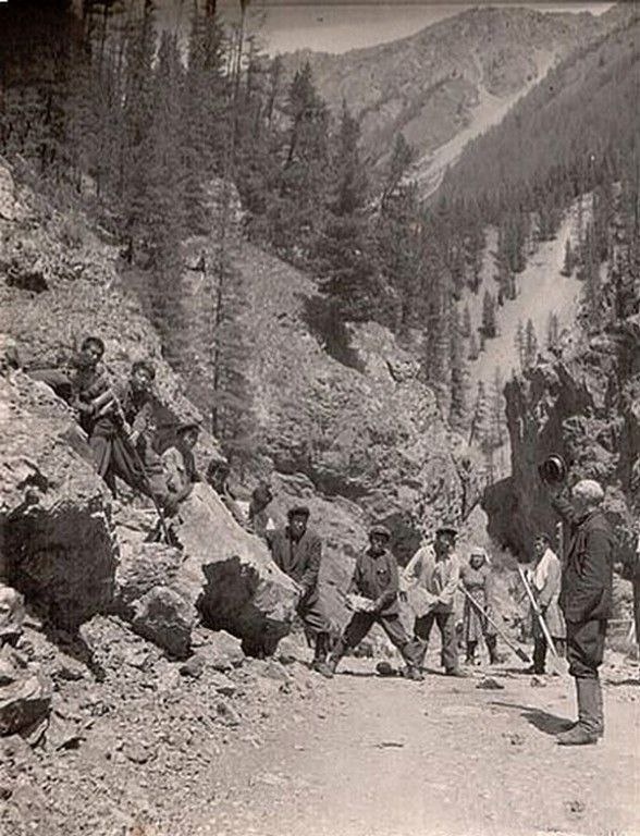 — Красные ворота. Это узкая расщелина в скале на левом берегу реки Чибитки, высота которой достигает 50 метров. Ворота — рукотворные. Они появились при прокладке автодороги Акташ – Улаган: путь в высокогорный район был пригоден только для вьючных лошадей, и чтобы провести трассу, скалу пришлось взорвать, рассказывает глава района Айдар Акчин. Названием и цветом ворота обязаны составу пород: здесь залегает ртутный минерал киноварь. Неподалеку от Акташа в 1942 году начали добывать ртуть для оборонной промышленности СССР. Но главное, что делает это место особенным, — историческая память. На скале бережно сохраняют надпись: «С.Д. Куюков, 16 мая 1946 г., С Богом возвращаюсь на РОДИНУ». Её оставил 19-летний солдат Семён Куюков, пешком возвращавшийся домой после Великой Отечественной войны. На фото: Красные ворота в 1948 и в наши дни