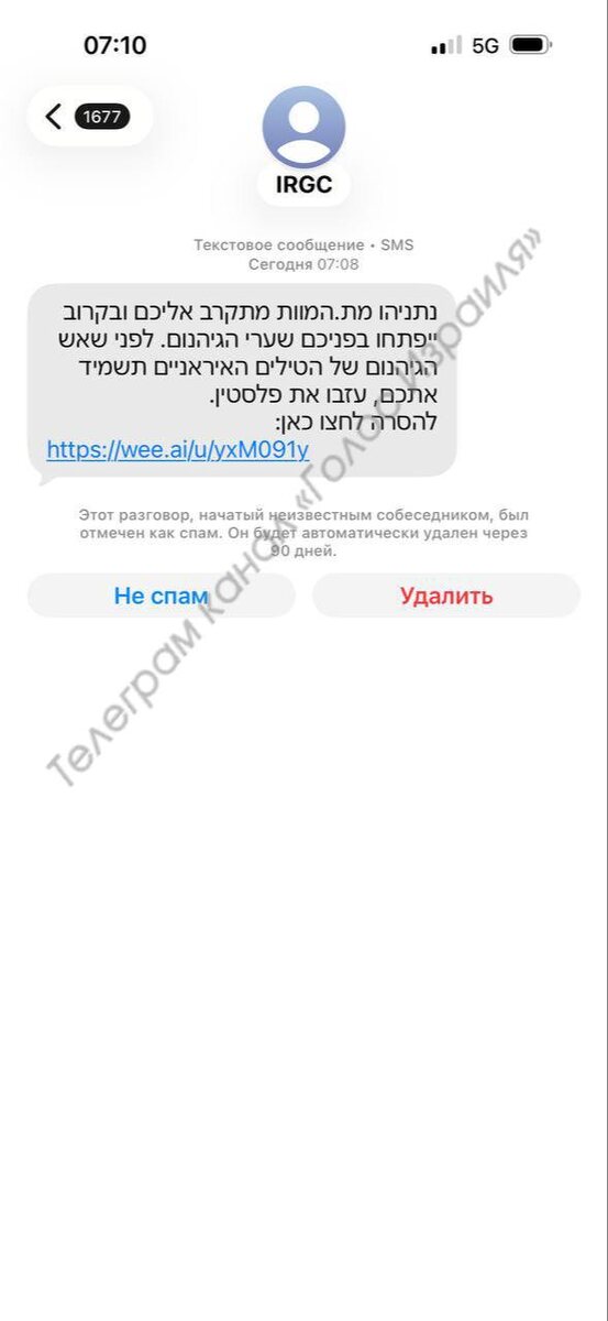 Одно сообщение рассылается от имени Службы тыла «Ореф» с просьбой перейти по ссылке. Не переходить. Второе рассылается от КСИР Ирана (IRGC) с текстом, содержащим фейки и угрозы с целью психологического террора: «Нетаньяху мёртв. Смерть приближается к вам, и скоро перед вами откроются врата ада. Прежде чем адский огонь иранских ракет уничтожит вас навсегда, покиньте Палестину». Иран даже не скрывает своих намерений уничтожить всё мирное население Израиля. Предупредите знакомых и близких. Предупрежден — значит вооружен. ___________ 🎙Будь в курсе событий 🇮🇱 Подпишись на «Голос Израиля»