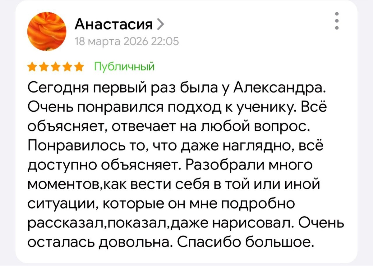 ! 😊 Очень рад, что мой подход к обучению оказался для Вас полезным и понятным. Для меня, как для инструктора, главное — не просто научить управлять машиной, а дать ученику полное понимание процессов на дороге, чтобы уверенность появилась с первых занятий. Ваш случай — отличный пример того, как теория (даже нарисованная на бумаге) и практические советы по поведению в реальных ситуациях помогают сложить цельную картину вождения 👍. Рад, что мы смогли разобрать все волнующие Вас моменты. Кстати, этот подход отлично работает для всех моих учеников в Костроме. Хотите так же уверенно чувствовать себя за рулём? Приглашаю всех желающих! Удобнее всего записаться на уроки вождения в Костроме на автомобиле с автоматической коробкой переключения передач онлайн: dikidi.net/1829681. Выбирайте удобное время, буду ждать! 🚗💨