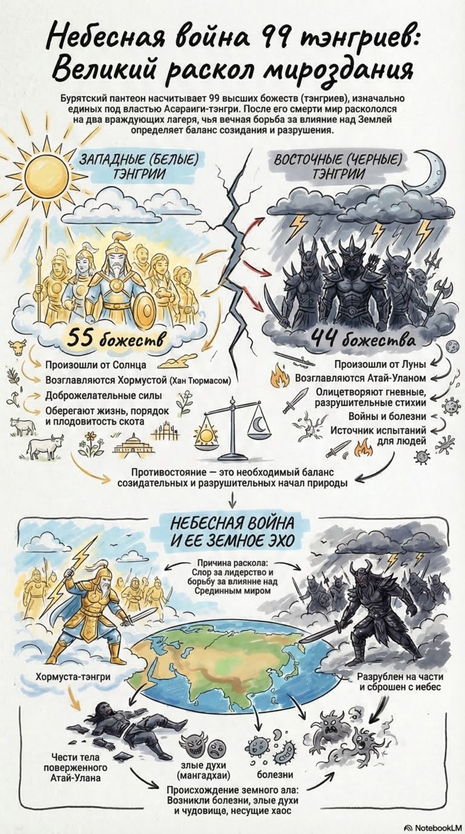 Бурятский пантеон насчитывает 99 высших божеств (тэнгриев), чей раскол определил баланс созидания и разрушения в мире. После смерти верховного владыки Асараиги-тэнгри мир разделился на два лагеря: 55 западных (белых) божеств под предводительством Хормусты и 44 восточных (черных) во главе с Атай-Уланом. Западные силы олицетворяют порядок, жизнь и плодородие, тогда как восточные связаны с разрушительными стихиями, войнами и болезнями. Земным эхом этого конфликта стало падение поверженного Атай-Улана: части его тела, сброшенные с небес Хормустой, превратились в злых духов (мангдхаев), недуги и чудовищ, несущих хаос. Таким образом, вечная борьба тэнгриев за влияние над Срединным миром является мифологическим объяснением существования зла и необходимости постоянного поддержания природного и духовного равновесия. Канал нашей студии https://t.me/chimitdorzhi_studio