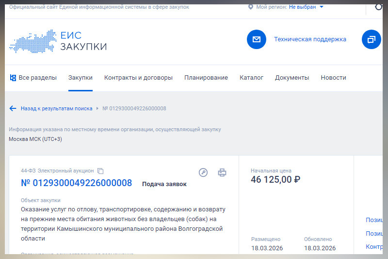 Администрация Камышинского района объявила торги на «Оказание услуг по отлову, транспортировке, содержанию и возврату на прежние места обитания животных без владельцев (собак) на территории Камышинского муниципального района Волгоградской области». Как сообщает infokam.su со ссылкой на конкурсную документацию, первоначальная цена контракта составляет 46 125 рублей. При этом средняя цена услуги в расчете на одно животное определена в размере 15 313 рублей. То есть в заказ «попадут» три собаки.