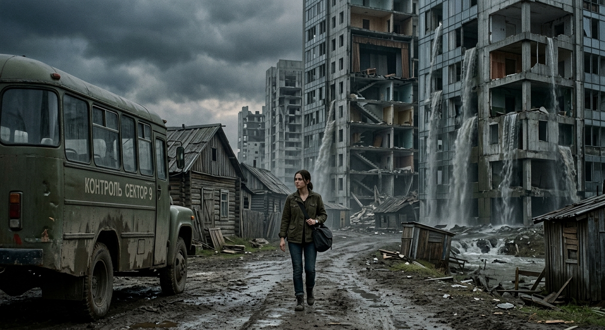 Это был хутор, раздавленный городом. Одноэтажные халупы из гнилого дерева стоя вплотную к стеклянным многоэтажкам без окон. Здания не были разрушены в привычном смысле. Они были раскрыты. Стены отсутствовали, обнажая квартиры, как декорации театра. Из пустых глазниц окон текла вода. Не дождь. Именно вода — густая, мутная, стекающая по бетонным плитам прямо на землю.