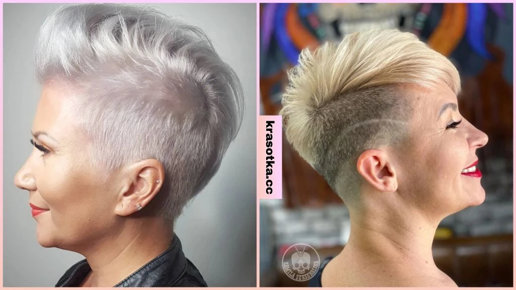 После 60 лет стоит попробовать разные стрижки. Седина на коротких волосах выглядит благородно. Такая прическа укладывается за пару минут. Выстриженные до кожи затылок и виски мгновенно уменьшают возраст на десять лет. Универсальной стрижкой стала фейд. Она не утяжеляет образ. Избавляет от лишних проблем с уходом и укладочными средствами. Даже у занятой бизнес-леди получится легким движением руки создать аккуратную укладку. Вариант понравится завсегдатаям дач и поклонницам велосипедных прогулок. Читайте также: Очень короткие стрижки для дам после 60 лет: 11 идей, которые позволят выглядеть молодо и привлекательно Для обновления шевелюры требуется создать плавный переход от экстремально коротких волос до более длинных прядей на макушке. На затылке приветствуется рисунок, выполненный машинкой. Бунтарский вариант вполне подойдет для дам, склонных к экспериментам и жизни "на полную катушку". По личному желанию клиентки длина волос на макушке может быть любой. В качестве летнего варианта вол