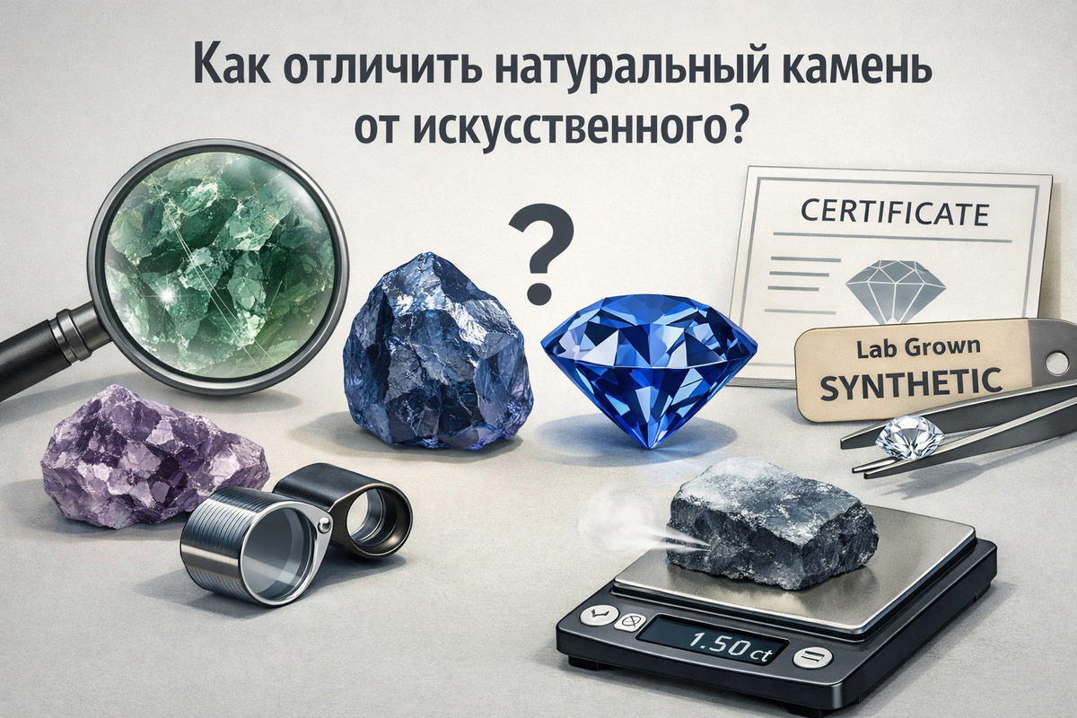 Ювелирные украшения с камнями выглядят эффектно, но не всегда понятно, что именно вы покупаете: природный минерал или его искусственный аналог. Внешне они могут быть почти одинаковыми, а вот цена и ценность — сильно различаются. Разберёмся, как отличить натуральный камень от искусственного без специального оборудования. Перед проверкой важно понимать разницу: Самое сложное — отличить именно натуральный камень от синтетического, потому что они почти идентичны. У натуральных камней почти всегда есть: Искусственные камни чаще выглядят идеально чистыми. Если камень «слишком идеальный» — это повод насторожиться. У природных камней: У искусственных: Натуральные камни: Имитации, например стекло: Натуральные камни обычно тяжелее, чем стекло или пластик. Например, фианит тяжелее стекла, но отличается от алмаза по другим параметрам. Если есть возможность сравнить, это хороший ориентир. Натуральные камни: Стекло и пластик: Но этот способ лучше не использовать — можно испортить украшение. Подышите