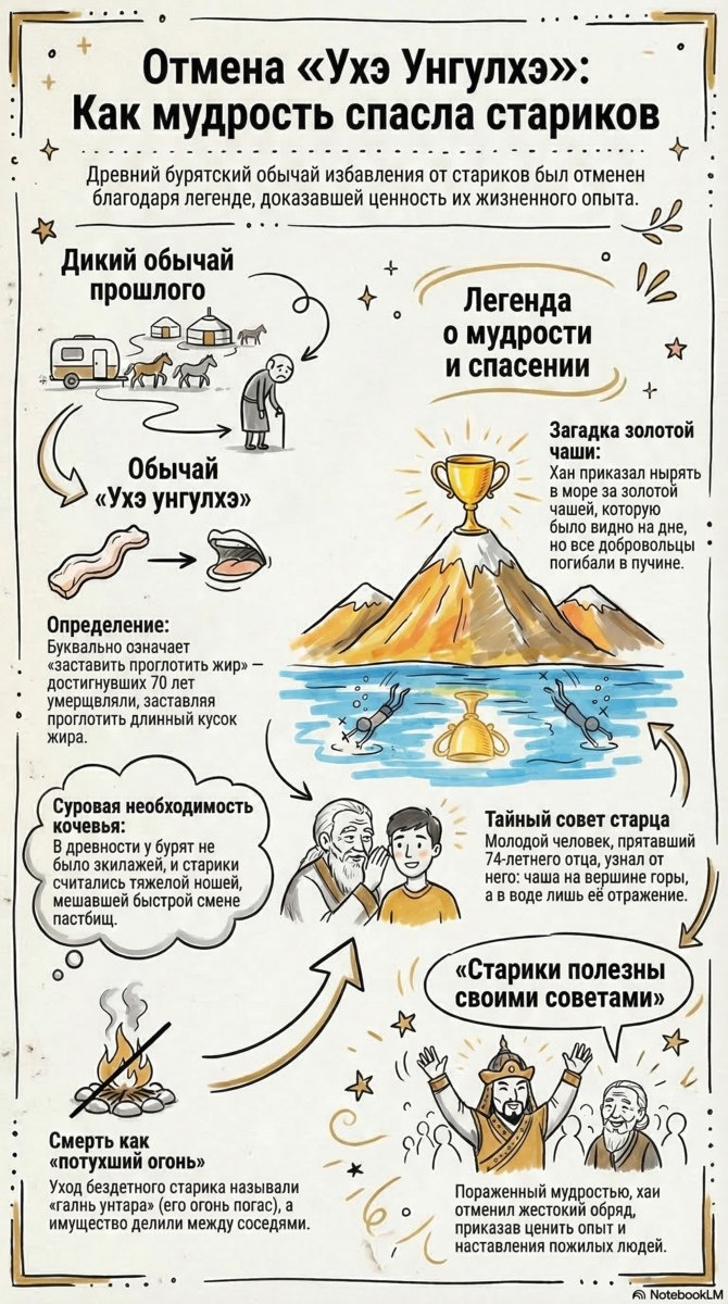 Ухэ унгэлхэ — архаичный обычай избавления от пожилых людей, вызванный суровыми условиями кочевья. Буквально название означает «заставить проглотить жир»: по достижении 70 лет человека умерщвляли, заставляя проглотить длинный кусок жира. Легенда об отмене ритуала связана с «Загадкой золотой чаши». Хан приказал нырять в море за чашей, которую было видно на дне, но все добровольцы гибли. Молодой человек по совету тайно скрываемого отца объяснил, что чаша стоит на вершине горы, а в воде — лишь ее отражение. Пораженный мудростью старца, хан отменил жестокий обряд. Сюжет подчеркивает ценность жизненного опыта для выживания общества. Уход бездетного старика называли «галнь унтара» (его огонь погас), а его имущество делили между соседями. Канал нашей студии https://t.me/chimitdorzhi_studio