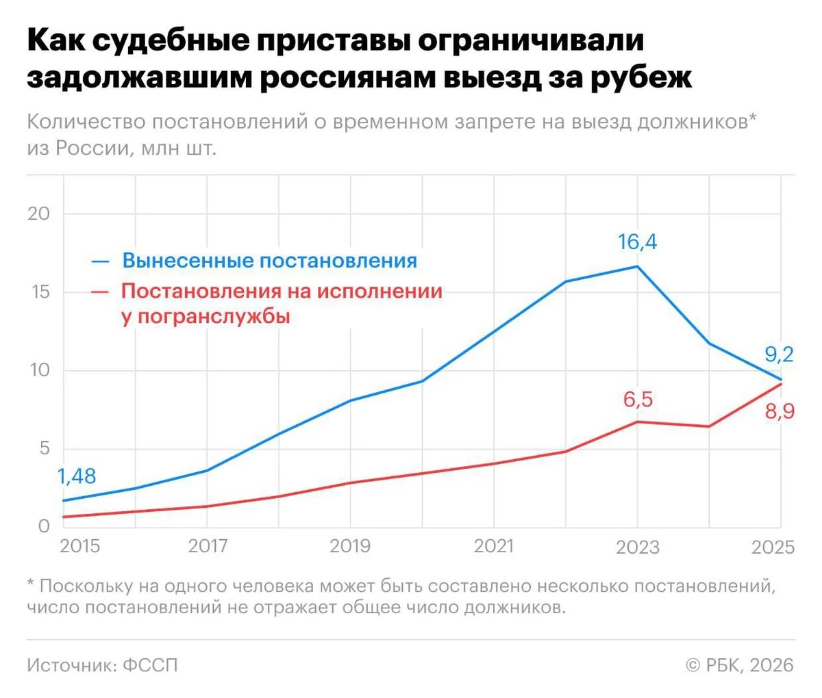 % ФСБ выдала 8,9 млн запретов на выезд за границу в 2025 году. Причины, последствия и анализ ситуации для граждан и бизнеса. Среди ключевых решений и фактов: В 2025 году ФСБ выдала 8,9 млн постановлений о запрете выезда за границу, что на 41,5% больше, чем в 2024-м; Основные причины запретов — долги по алиментам и компенсациям вреда от 10 тыс. руб., по другим долгам — от 30 тыс. руб; Число постановлений превышает количество невыездных граждан, так как на одного человека может быть несколько производств; Рекордный рост с 2019 года: в 2024… Читать полностью
