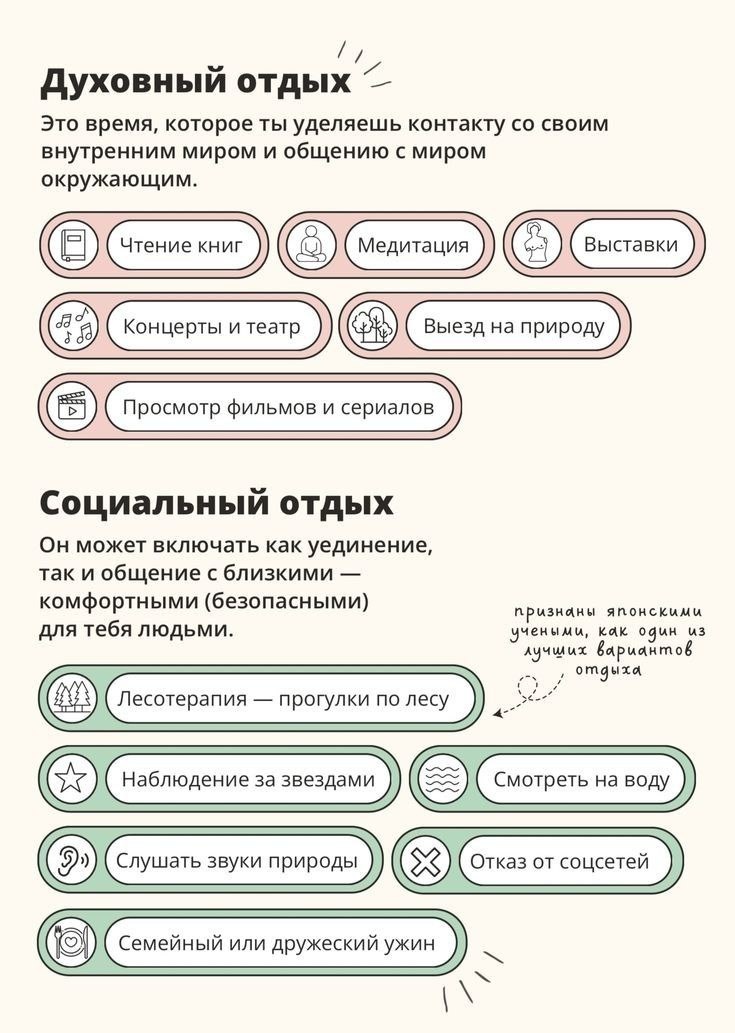 ! Я бы сделала немного другую градацию в этой табличке, но в целом важен ведь смысл и способы, чтобы привести свое внутреннее состояние в норму. ☀️ И, заметьте, шумные вечеринки с алкоголем, активный туризм и отдых со спортом - это не отдых, а другой вид деятельности. Ключевое слово - деятельности. 😊
