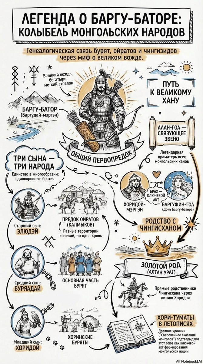 Легенда о Баргу-баторе (Баргудай-мэргэне) фиксирует генеалогическую связь бурят, ойратов и чингизидов. Общий первопредок имел трех сыновей: Элюдэя (предок ойратов/калмыков), Бурядая (основная часть бурят) и Хоридоя (хоринские буряты). Брак Хоридой-мэргэна с Баргужин-гоа, дочерью Баргу-батора, связывает эти роды с «Золотым родом» (Алтан ураг). Алан-гоа, легендарная праматерь монгольских ханов, является связующим звеном в этой цепи. Древние хроники, включая «Сокровенное сказание монголов», подтверждают эти союзы как ключевой акт формирования монгольской нации. Баргузинская долина в мифологии выступает как колыбель народов, объединяющая разные территории кочевий единой кровью и общим историческим наследием. Канал нашей студии https://t.me/chimitdorzhi_studio