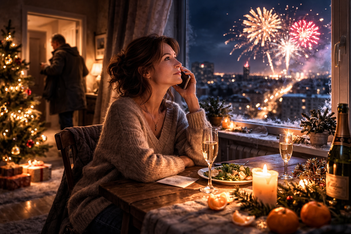 — Пять минут до Нового года, — сказал телевизор привычным, чуть торжественным голосом. Оля стояла на кухне, машинально помешивая салат, и вдруг поймала себя на мысли: этот звук она слышит каждый год. И каждый раз надеется, что следующий будет другим. В комнате уже был накрыт стол. Свечи, бокалы, мандарины — всё, как положено. Только за этим столом она была одна. Телефон молчал. Муж должен был вернуться ещё два часа назад. «Задерживаюсь, не начинай без меня», — написал он коротко и больше не выходил на связь. Оля сначала злилась. Потом оправдывала: пробки, работа, случайности. Потом просто перестала думать. Она посмотрела на часы. 23:55. Пять минут. Когда-то это время было самым важным моментом года. Загадывали желания, смеялись, обнимались, верили, что впереди — только лучшее. Теперь это было просто время. Она выключила свет на кухне и прошла в комнату. Телевизор тихо говорил о чуде, о надежде, о новых началах. Оля села за стол и вдруг почувствовала странную пустоту. Не одиночество — к