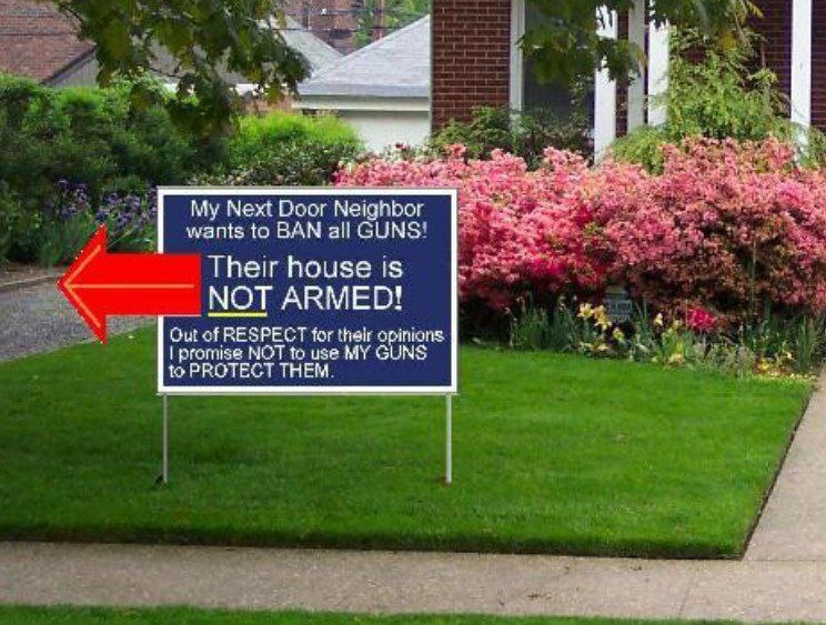 😏 Примерный перевод с плаката: "Мои соседи хотят запретить все оружие. У них в доме оружия НЕТ! Уважая их мнение, обещаю не использовать мое оружие для их защиты."