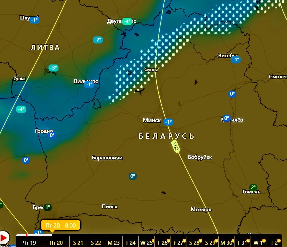 ! Погода: в Минске - Время 08:43 19.03.2026 🌡 -3.9°C в Полоцке - Время 08:44 19.03.2026 🌡 -2.8°C, дымка Сегодня днем ожидается малооблачная погода, +9..11°, ветер слабый. Давление немного выше нормы. . Ближайшей ночью переменная облачность, температура +3..+5°. Атмосферное давление в пределах нормы. 20 марта, в течение суток ожидается переменная облачность, возможен даже небольшой снег, туман; ночью и днем +3..+5°, ветер северный, умеренный.