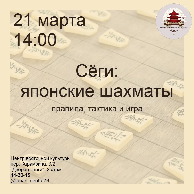 🧩 21 марта (суббота) в 14:00 в Центре Восточной культуры впервые пройдет занятие по игре в Сёги! 🎲 Сёги – японская игра шахматного типа, ее название дословно переводится как «игра генералов». На занятии ведущий расскажет об истории игры, объяснит правила и вы сможете проверить свои знания и стратегическое мышление! 👉 Можно прийти одному, с друзьями, детьми (рекомендуемый возраст 12+). ✅ Вход свободный, необходимо записаться в сообщениях группы Центра восточной культуры (https://clck.ru/3ScoW3), чтобы всем хватило досок. 🙌 Ждем вас во Дворце книги (Пер. Карамзина, 3/2, 3 этаж, 307 каб.) #ДворецКниги_афиша