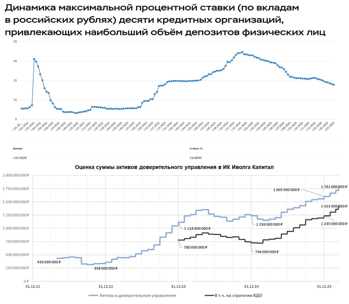 👉Наш канал в Max👈 На приведенной паре графиков я вижу корреляцию. Сверху – средняя ставка по депозитам (от Банка России), снизу – активы Иволги Капитал в доверительном управлении, которые по большей части состоят из вложений в облигации. Не склонен считать, что притоки и оттоки средств к нам в управление – прямое следствие качества управления. Качество – одно из условий. Внешняя среда, думаю, важнее. А внешняя среда – это в первую очередь состояние рынка депозитов. Год назад депозит многими считался лучшим из вложений. Рынок облигаций денег недополучал, а еще раньше облигации должны были испытывать их отток. Сейчас ситуация обратная. % по депозиту уже 13. Денежный рынок 15% (без реинвестирования). Облигации – очень часто 20%+. Не думаю, что приведенное соотношение может быстро измениться. У облигаций высокие доходности неспроста. И снижением ключевой ставки они не очень регулируются. А вот внезапный рост валюты – важное обстоятельство, которое опять же многих может навести размышлени
