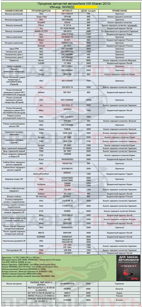 Процен основных запчастей на 🏎 VOLKSWAGEN SHARAN, 2012г